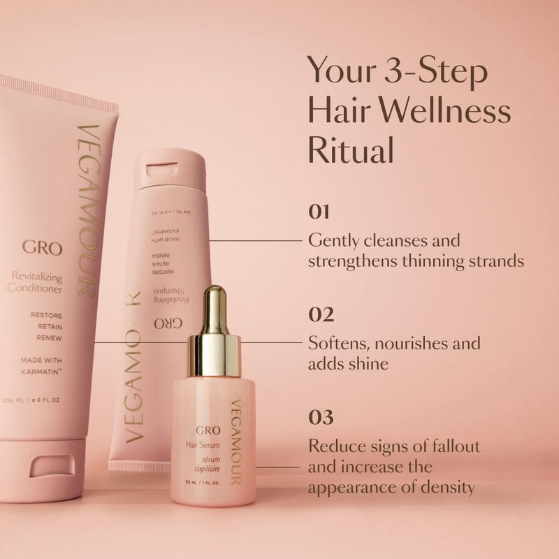 VEGAMOUR GRO Revitalizing Shampoo does so much more than simply cleanse. The clean, color-safe formula utilizes advanced microencapsulation technology, delivering phyto-actives deep within the scalp, thicker, fuller, and longer-looking hair. Enhanced with vegan keratin** Karmatin, a microencapsulated vegan b-SILK protein, which stays attached to your hair even after rinsing, the shampoo cleanses and recalibrates, leaving hair as soft and smooth as glass. ***Results from a double-blind, in-vivo clinical trial involving 40 subjects, 18-60 years old, over 150 days. ** Over 96% of keratin found in hair care products is derived from animal parts. These statements have not been evaluated by the Food & Drug Administration. This product is not intended to diagnose, treat, cure, or prevent any disease.