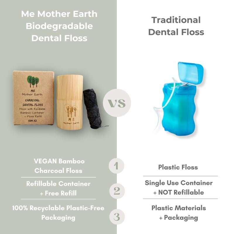 - ✔️ VEGAN AND CRUELTY-FREE unlike silk floss - Our ECO FLOSS is Biodegradable, made from Bamboo Charcoal Fiber so it breaks down FAST. Packaging is all recyclable or biodegradable.