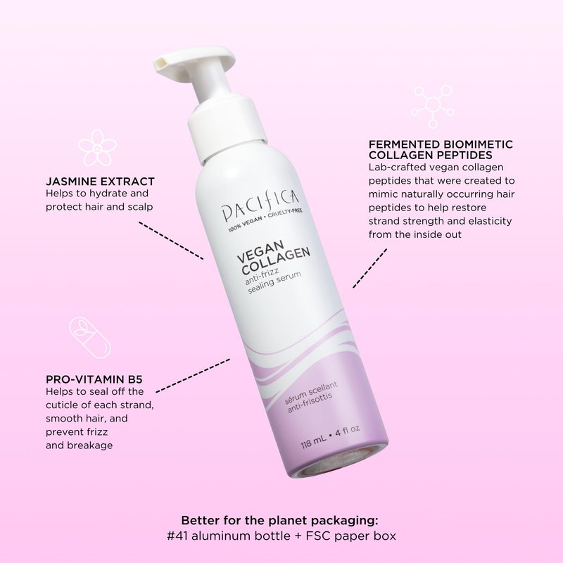 Vegan Collagen Anti Frizz Sealing Serum, Haircare, Frizz Control, Lightweight, Seal Split Ends, Soft and Silky Hair, Light Jasmine Scent, Silicone Free, For Dry Hair, Color Safe, 4 fl oz (1 Count)