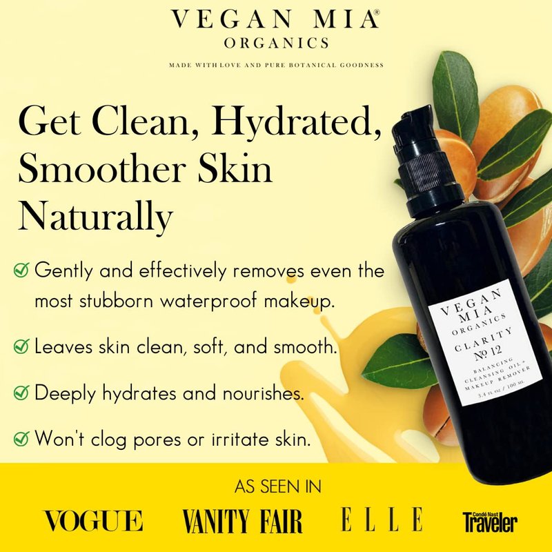 Give your skin the loving care it deserves with Clarity Balancing Cleansing Oil Makeup Remover. A deeply nourishing facial cleanser, it gently but efficiently removes impurities and makeup without stripping away the natural moisture barrier. Regular use keeps your skin well-balanced and deeply hydrated.Luxurious Blend of Fruit OilsFor our facial cleansing oils, we use only organic Passionfruit and Jojoba.Self-Care Without CompromiseVegan Mia is an eco-conscious beauty brand. We craft our products with love and only pure botanical goodness. No chemicals, artificial fragrances, colors and synthetic ingredients! Our Clean + Green PromiseWe use only 100% natural ingredients sourced from trusted partners who share our values and our commitment to purity, quality and the environment. To fight the effects of climate change, we offset our carbon emissions from shipping. With the help of EcoCart, we invest in environmental projects like building wind/solar farms, protecting trees and animals or supporting underserved communities.A Mother's Love - Our StoryCreated by a mother determined to find softer, more natural solutions for her son's severe skin condition, Vegan Mia Organics focuses on purely natural, plant-based skincare. We only provide products that are good for you, kind to animals and beneficial for the planet. Consciously crafted, our products help nourish your skin, enliven your senses and encourage a holistic approach to health and living.Give your skin wellness, wonder and lots of love with Vegan Mia Organics now!