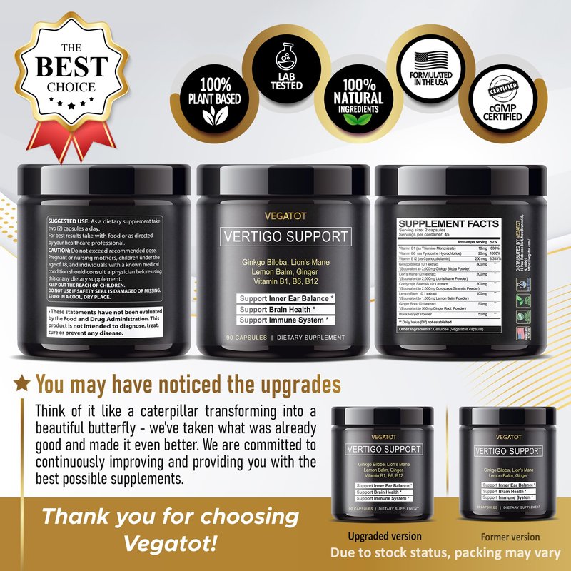 - 𝗠𝗢𝗦𝗧 𝗣𝗢𝗪𝗘𝗥𝗙𝗨𝗟 𝗖𝗢𝗠𝗕𝗜𝗡𝗔𝗧𝗜𝗢𝗡: Each serving of Vegatot Vertigo Support packs a combination of 9 powerful ingredients. Vitamins B1, B6, and B12 are essential for a healthy brain and nerve function. While Ginkgo Biloba, Lion's Mane, Lemon Balm, Cordyceps Sinensis work together to enhance memory and boost focus and Black Pepper is added to improve absorption ability. All of them work together to support vertigo comforting and boost your healthy brain performance effectively