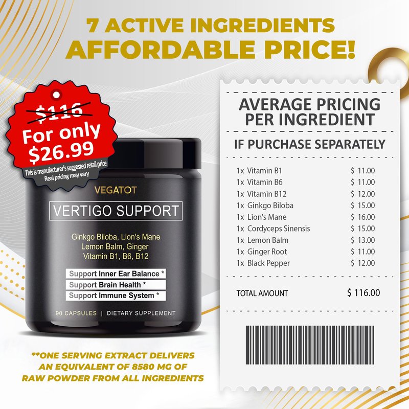 - 𝗛𝗜𝗚𝗛𝗘𝗦𝗧 𝗣𝗢𝗧𝗘𝗡𝗖𝗬: Vegatot Vertigo Support supplement combines 9 powerful ingredients, specially sellected for their unique beneficial properties. With our advanced complex, you no longer need to juggle multiple supplements. This all-natural vertigo supplement is perfect to comfort your vertigo.