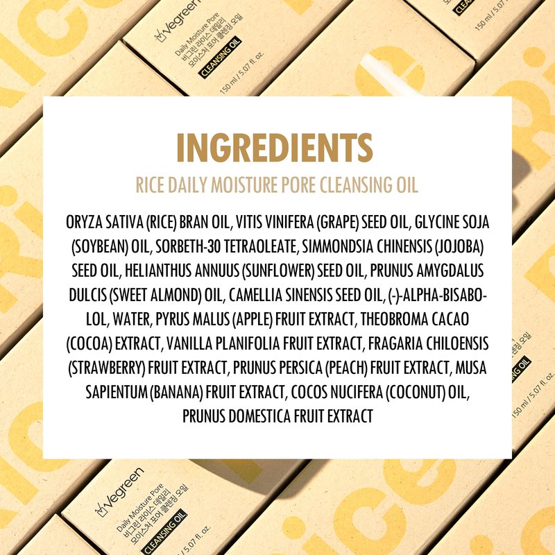 - GENTLE CLEANSING ELIXIR. VEGREEN Rice Daily Moisture Pore Cleansing Oil is a lightweight face cleansing oil that harnesses the power of Rice Bran, Grape Seed, and Jojoba Oils to dissolve makeup and impurities. Its delicate watery consistency ensures a deep cleanse without leaving any residue.