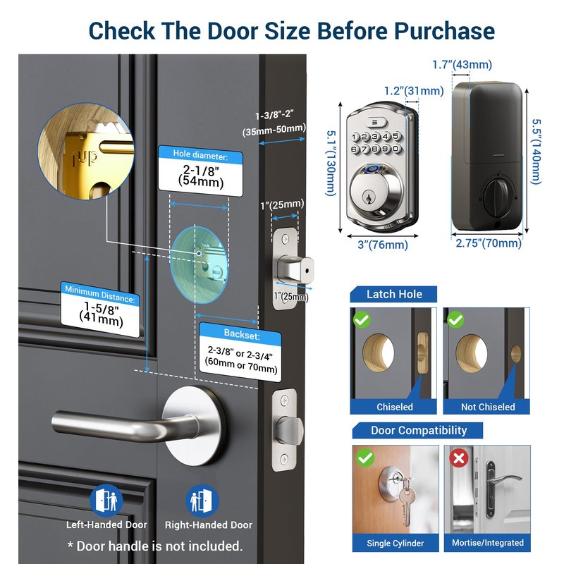 - Fingerprint Unlock: Identify your fingerprint within 0.3 seconds, unlock your door within 1 second. The biometric fingerprint recognition rate is 99.99%.