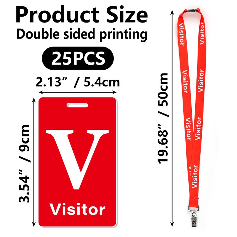 - 【Value Package】You will receive 25 pieces of PVC visitor badges and 25 pieces of visitor lanyards with clips.The size of badge measures about 2.13 x 3.54 inch/ 5.4 x 9cm,and the length of lanyard is about 19.68 inch/ 50cm,lightweight and long enough for most adults to wear.Convenient combination for guests to use at any event,and enough quantity to meet your activities need.