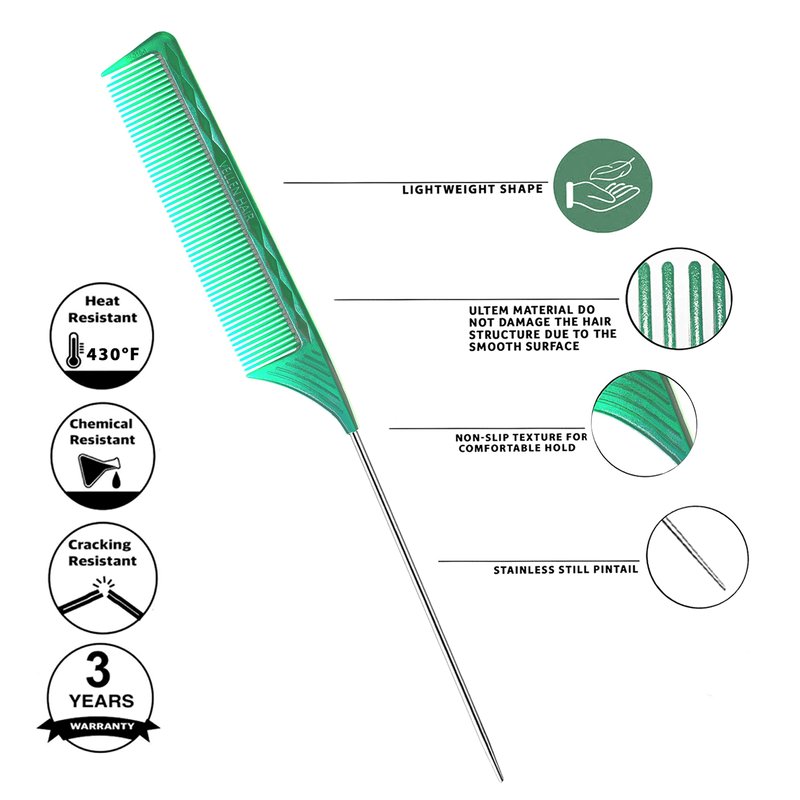 Vellen Hair Professional 9 Inch rat tail combs for hair stylists, PEI Material 430°F Heat Resistant and Antistatic, Pin tail comb with Long stainless steel for parting, styling and highlighting - 3 Pack (Green-Transparent)
