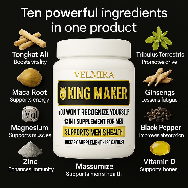 Velmira™ .King Maker Supplement for Men 13-in-1.Sugar-Free .Energy Support .Muscle Recovery.Health Support -Zinc-Tongkat Ali -Maca-Magnesium-Vitamin D3. Supplement.120 Capsules-(1) kin .Pack of 1