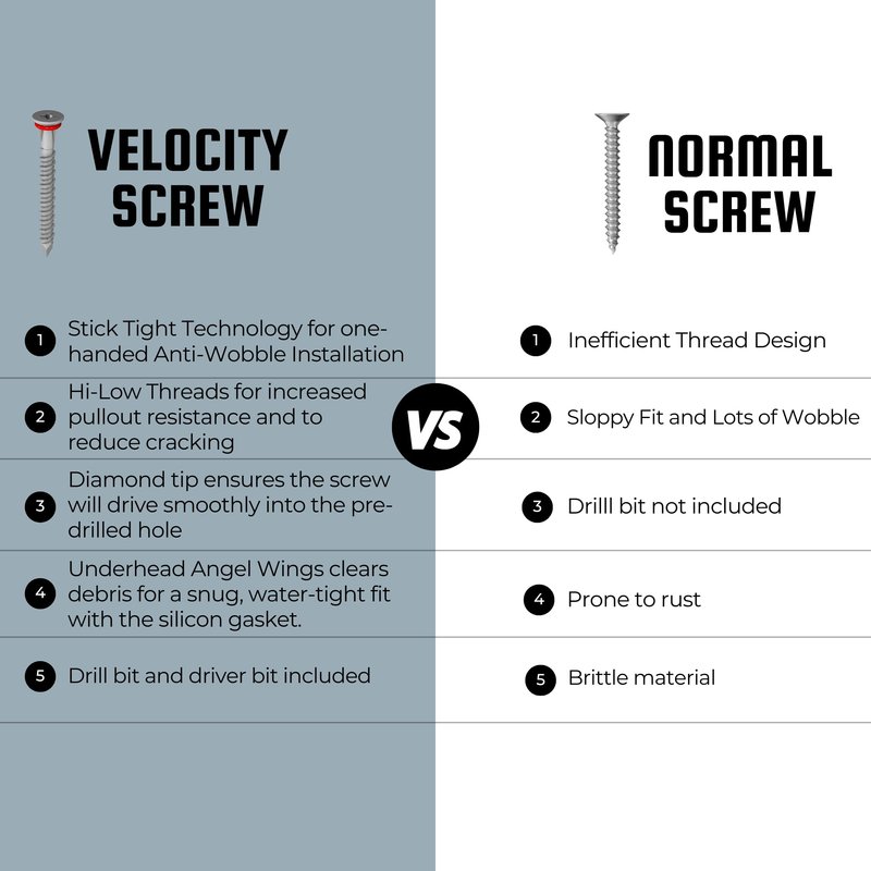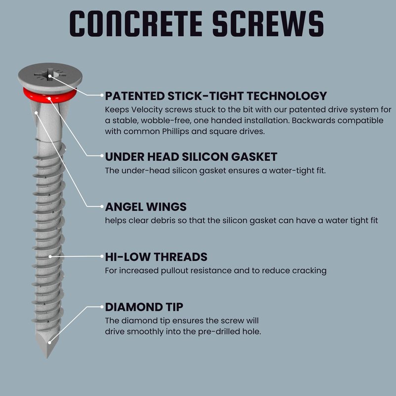 - 𝗥𝗲𝗱𝗦𝗲𝗮𝗹 𝗠𝗼𝗶𝘀𝘁𝘂𝗿𝗲 𝗕𝗮𝗿𝗿𝗶𝗲𝗿: Velocity Concrete Screws are designed with Patented RedSeal Technology, complete with patented Angel Wings for the ultimate moisture barrier system. This creates an impenetrable barrier and ensures a tight seal, making these the ideal exterior screws for your outdoor needs, from installing hose reels to flag poles.