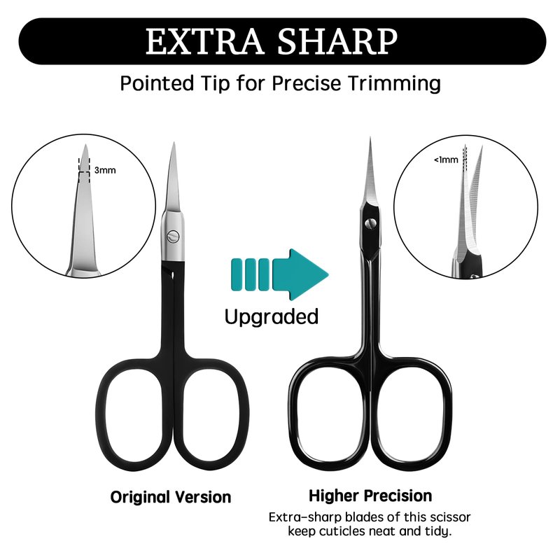 - Upgraded Curved Tip Design:Upgraded professional Cuticle Scissors with ultra-fine (<0.1mm) curved precision pointed tip provide smoother, more precision cuts and trims.