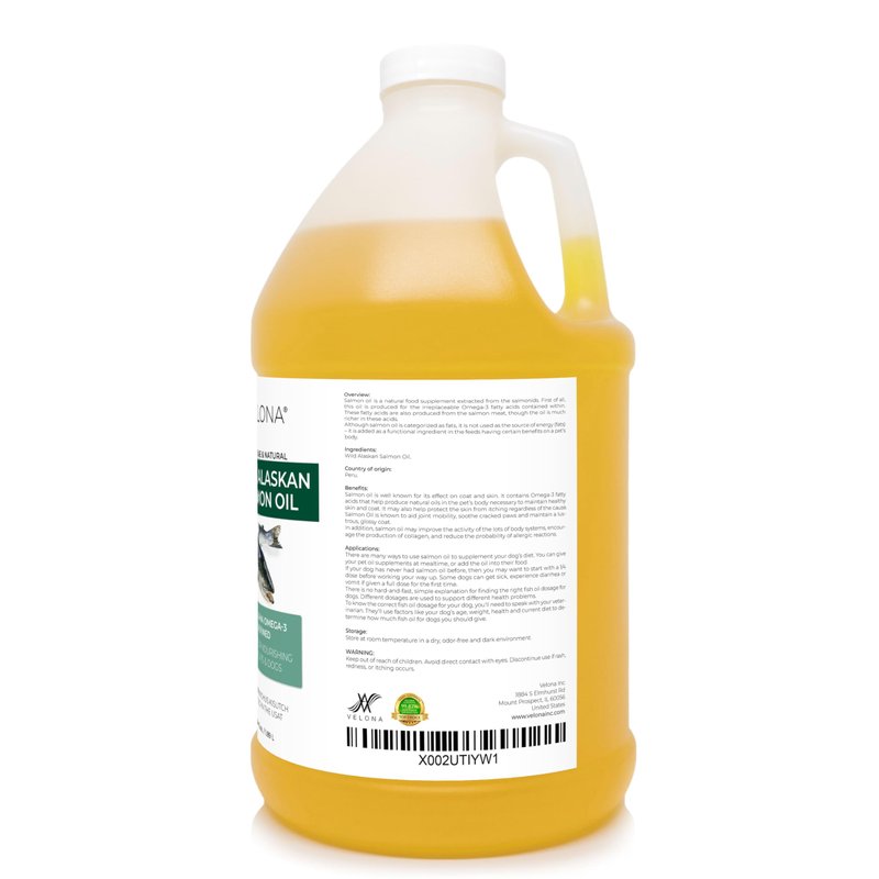 Velona Wild Alaskan Salmon Oil - 64 oz | 100% Pure Refined Oil | for Dogs & Cats - Supports Joint Function | Omega 3 Liquid Food Supplement for Pets - Natural EPA + DHA Fatty Acids for Skin & Coat