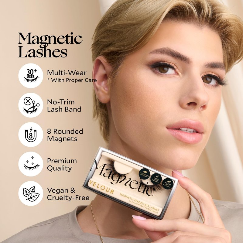 - INNOVATIVE MAGNETIC DESIGN: Discover the ease of flawless lash application with Velour's Magnetic Eyelashes, an extension of the award-winning Effortless Collection. These natural magnetic lashes are equipped with 8 lightweight, rounded magnets on a flexible cotton band, ensuring a strong, comfortable hold.