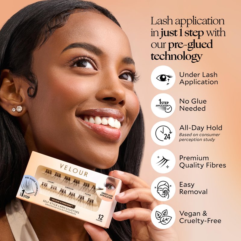 - SELF ADHESIVE LASH CLUSTERS - Lash application in just 1 step with Velour pre-glued technology! Perfect for beginners, these self-adhesive lash clusters are easy to apply and mess-free.