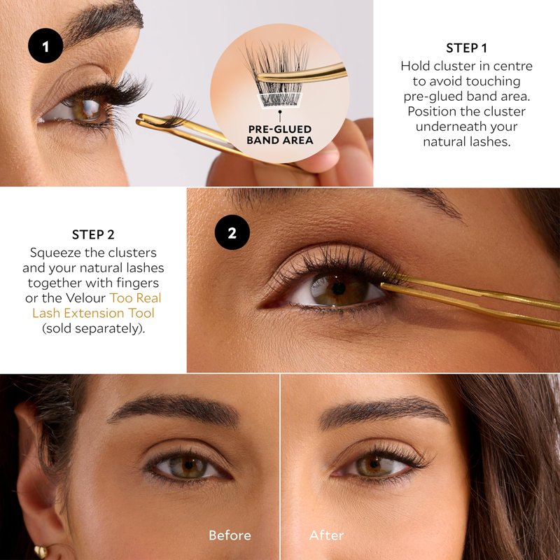 - LIGHTWEIGHT & NATURAL-LOOKING EYELASH CLUSTERS - Handmade with lightweight and natural-looking fibres, Velour Self-Stick Lash Clusters are pre-glued lash clusters that are applied underneath your natural lashes for a seamless lash extension look.