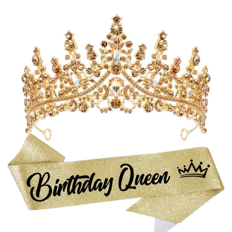 VELSCRUN Birthday Queen Tiara Crowns for Women Girls Gold Crystal Birthday Queen Headband Sash Elegant Princess Crown Happy Birthday Party Decorations Mom Sisters Birthday Gift Hair Accessories