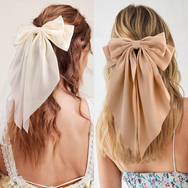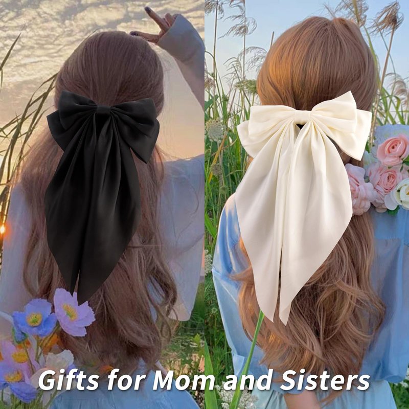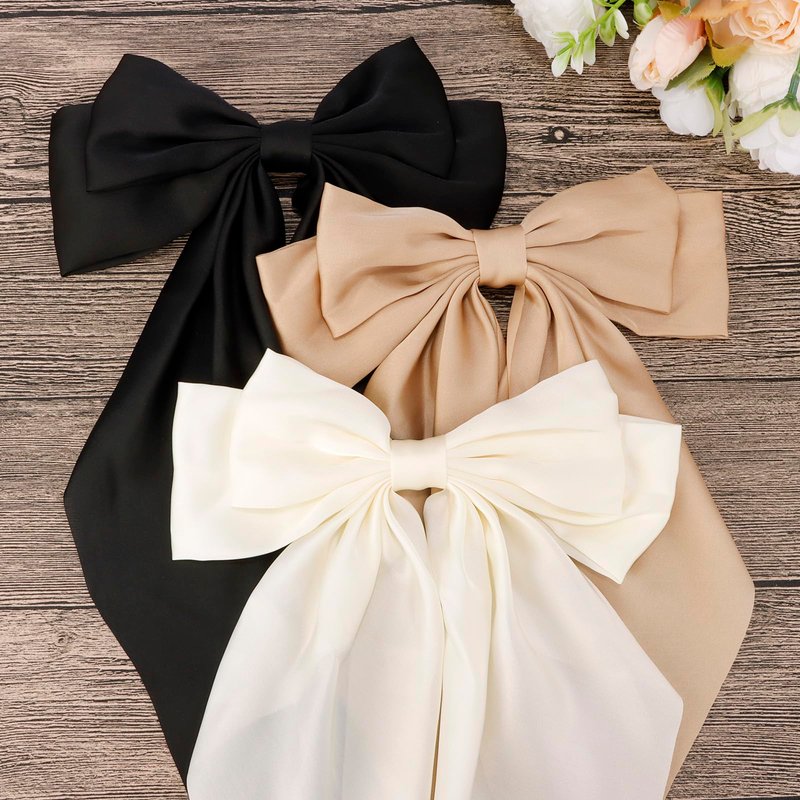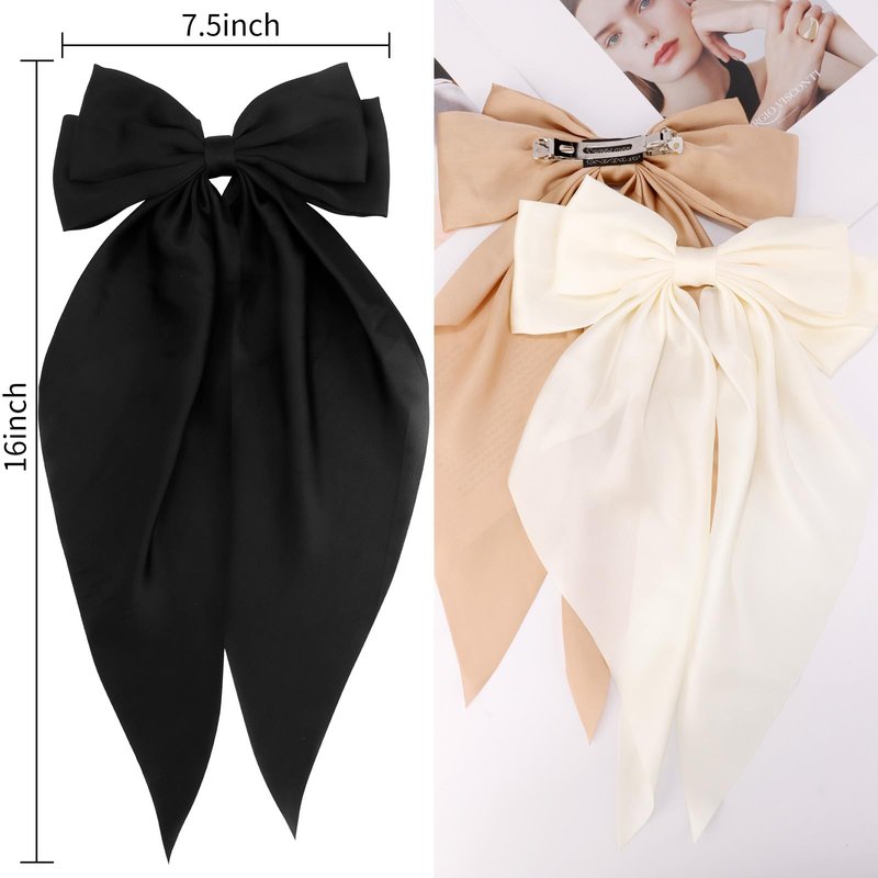 VELSCRUN Hair Bows for Women - 3Pcs Big Hair Clips in White, Black, Brown - Silky Satin Hair Barrettes with Oversized Long Tail - Hair Accessories for Long Hair, Curly, Wavy, Fine, Thick - Gift