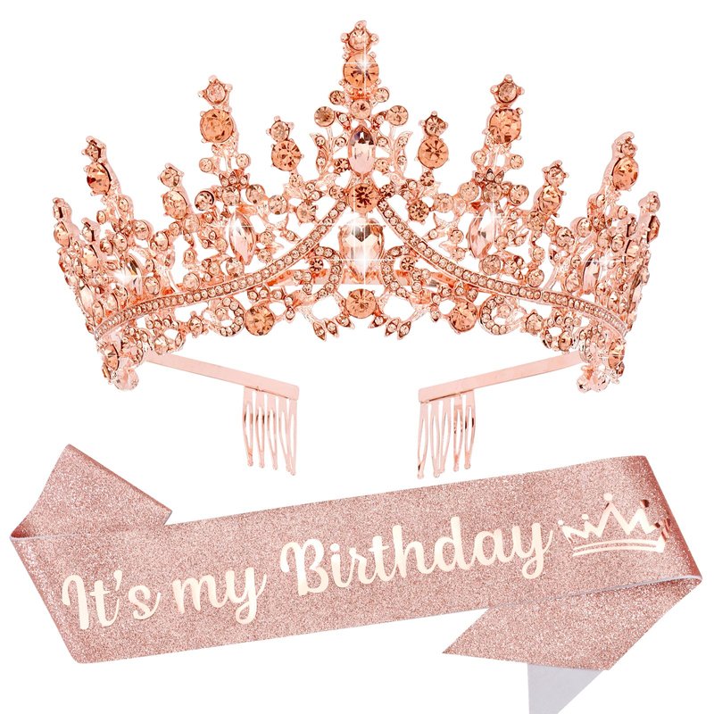 VELSCRUN Rose Gold Crystal Birthday Tiara Crowns for Women Girls It's My Birthday Sash Queen Girls Princess Crown with Combs Happy Birthday Party Decorations Mom Sisters Birthday Gift Hair Accessories