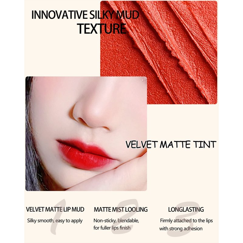 - INK VELVET MATTE LIP MUD TINTED - Our small feeding bottle lip mud have 6 colors available, use a breakthrough formula, innovative mud texture, high intensity color pigments that naturally stain your lips. The texture goes on silky and will last throughout the day.