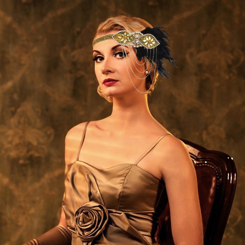 - Feature: Gatsby flapper headpiece features gold crystal rhinestones in a beautiful pattern with a rhinestones chain.They are combined with soft,flowing black feathers,making headband looked shiny and charming,and it perfectly matches to most party dress.