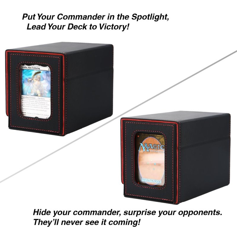- 【Patented Design】Our innovative window design is specifically tailored for EDH Commander players and is versatile enough to accommodate Leader cards. Securely store your Commander/Leader card in the included 35PT one touch card holder, and proudly display it in the specially designed card slot. This unique feature ensures that you can quickly identify which deck is inside each card box. It can also prop itself up using its own lid, making it convenient for easy access.