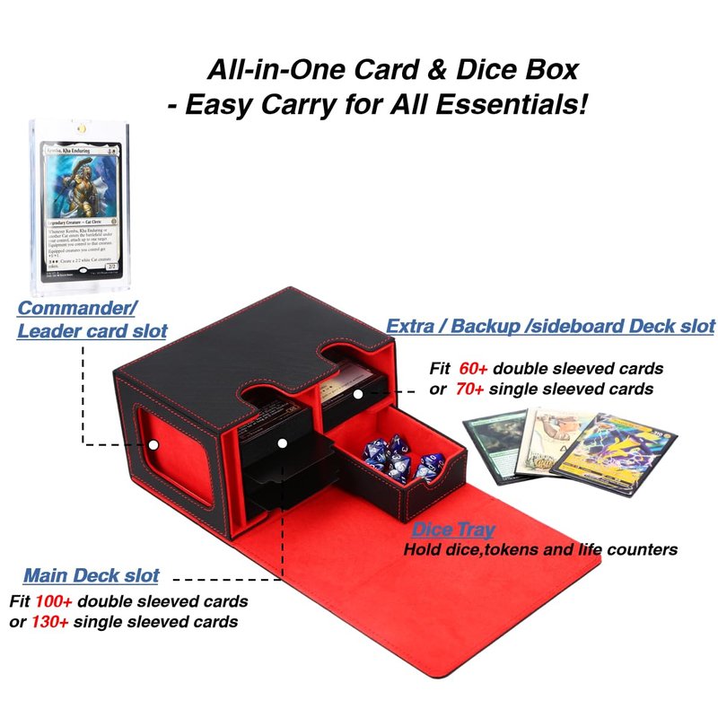 - 【All-In-One Deck Storage Solution】This commander deck box boasts two compartments: one for the main deck, accommodating up to 130 single-sleeve or 100 double-sleeve standard-sized cards, and a second for the extra deck or sideboard, with capacity for an additional 70 single-sleeve or 60 double-sleeve standard-sized cards. This design is perfect for players who use both a commander and a standard deck.It also includes an integrated pull-out drawer for dice ,life counters,coins and small accessories, enhancing organization and eliminating the need for multiple boxes and a separate dice box.