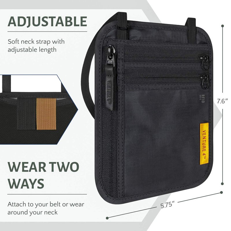 VENTURE 4TH delivers peace of mind for cruises, festivals, and international travel.Our new Anti-Theft RFID-blocking passport and vaccine card holder combo offers style and security in one incredible package. Available in a variety of color options, this concealed safety wallet is durable, lightweight, and easy to wear.Under even the thinnest layers of clothing, your neck pouch will remain practically invisible, with a breathable design that keeps you comfortable all day long. YKK zippers and rip-stop fabric ensure that this will be your go-to travel pouch for any trip. Your new RFID passport wallet even comes with a lifetime warranty. You can rest assured that you're in good hands.Ideal for men and women alike, this travel wallet is RFID protected to the highest standards. That means that your contactless cards, credit cards, and passport chips are defended against even the savviest of skimmers. This state-of-the-art hidden wallet for travel features:- FIPS 201 approved and ISO 1443/15693 shielded material for RFID travel protection- Invisible slimline pickpocket proof design that fits seamlessly under clothes- Maximum comfort with multiple storage compartments- Stylish passport pouch color choices- Lightweight adjustable strap design perfect for any occasionComplete Peace of Mind for International TravelWe designed this travel wallet with your safety and comfort in mind. Like many of our state-of-the-art neck wallets, it's designed for all-day wear, and absolute peace of mind. The RFID pouch protects against skimming, while your passport neck holder ensures that you have a secure storage space for all your must-have items, from cash to cards.Whether you're storing your smartphone or passports, this travel neck pouch keeps your valuables discreetly hidden, and out of reach. As the ultimate provider of travel wallets, VENTURE 4TH knows how to give you the comfort you deserve.