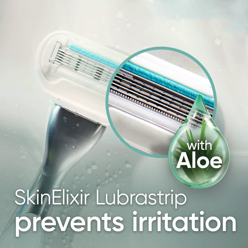 - FOR SENSITIVE SKIN: This female razor has a SkinElixir lubrastrip with a touch of Aloe Vera for glide, to deliver an extra smooth shave that lasts, with up to 0% irritation (US Consumer Study Feb 2018). Dermatologically recommended for sensitive skin