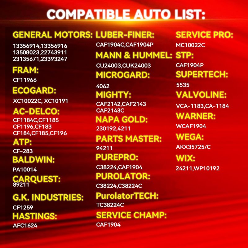 - 【Replacement Part Number】Replacement for GENERAL MOTORS:13356914,13356916,13508023,22743911,23135671,23393247; ATP:CF-283; BALDWIN:PA10014; CARQUEST:89211; G.K. INDUSTRIES:CF1259; HASTINGS:AFC1624; LUBER-FINER:CAF1904C,CAF1904P; MANN & HUMMEL:CU24003,CUK24003; MICROGARD:4062; MIGHTY:CAF2142,CAF2143,CAF2143C; NAPA GOLD:230192,4211.....(See product description for more replacement part numbers).