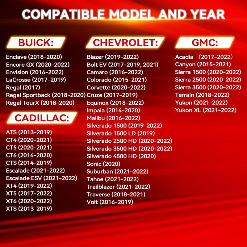 - 【Applicable Models】Cabin air filter for Chevrolet Models: Blazer (2019-2022) Bolt EV (2017-2019, 2021) Camaro (2016-2022) Colorado (2015-2021) Corvette (2020-2022) Cruze (2017-2019) Equinox (2018-2022) Impala (2014-2020) Malibu (2016-2022) Silverado 1500 (2019-2022) Silverado 1500 LD (2019) Silverado 2500/3500 HD (2020-2022) Silverado 4500/5500/6500 HD (2020) Sonic (2020) Suburban (2021-2022) Tahoe (2021-2022) Trailblazer (2021-2022) Traverse (2018-2021) Volt (2016-2019).