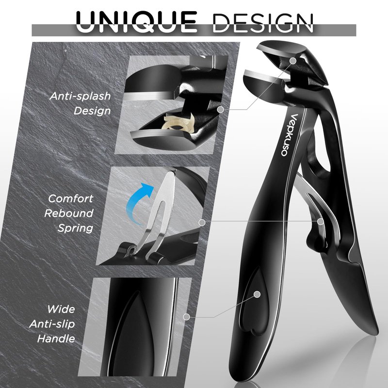 - ERGONOMIC&INNOVATIVE: Vepkuso toenail trimmers are unique. The angle design for the thick toenail clipper makes it easy to cut toenails and works like the nail clipper with catcher to avoid the clippings everywhere .The Vepkuso toenail clipper can help to reduce the need for uncomfortable bending. It is the best toenail cutter for the pregnant,eldly,lumbago and obese people.