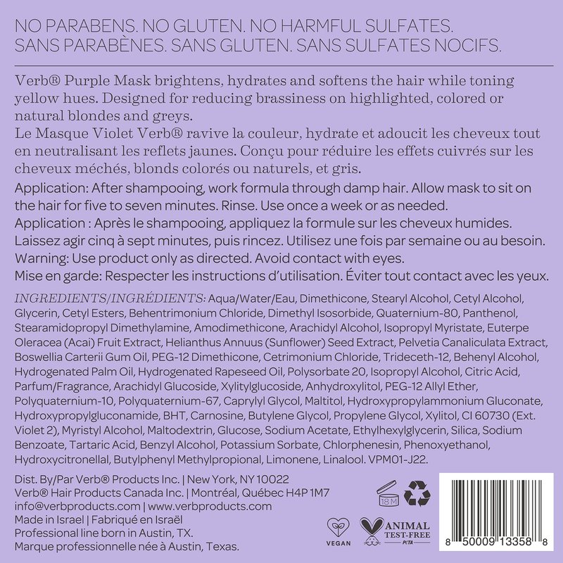 - BRIGHT, VIBRANT TONES: Verb Purple Hair Mask deposits a small amount of violet pigment into hair to keep blondes bright; the toning hair mask does not contain permanent dye and can be washed out with any Verb shampoo
