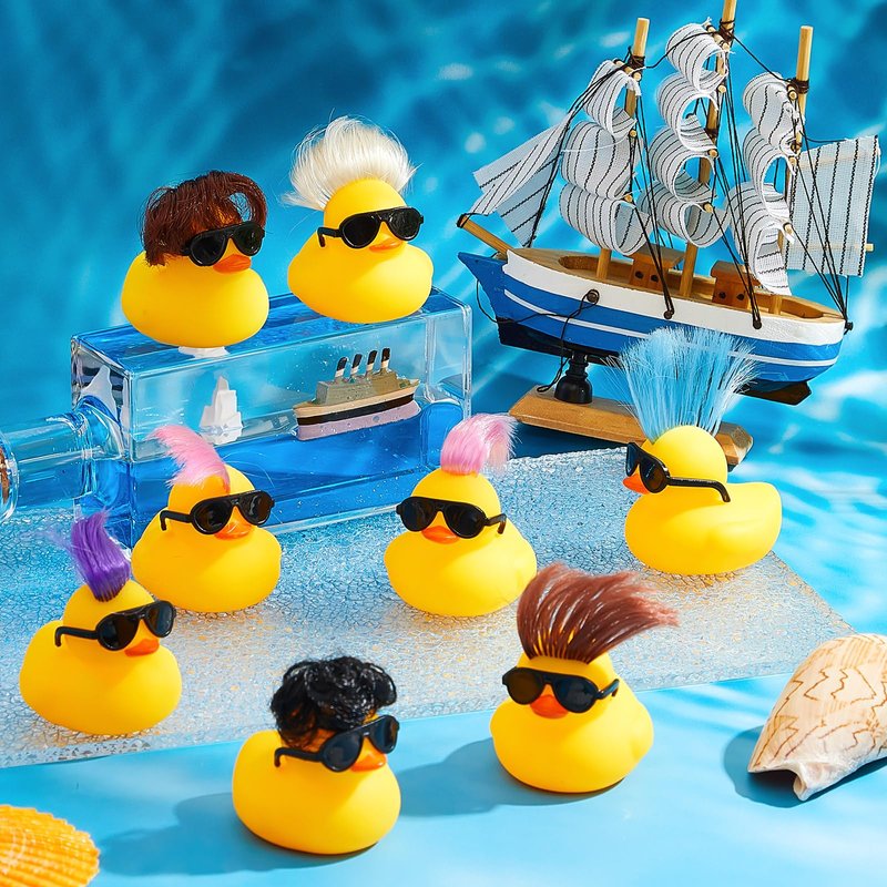 - Rubber Duck Bath Toy Set: presenting our impressive 20 pieces of rubber ducks with solid glasses and wig that will elevate the fun during bath time; This set is inclusive of ducks exuding 8 different styles meant to cater to diverse preferences of your children; Made from rubber material, these seemingly adorable toys don't just float on water but turn bath time into a fun filled adventure