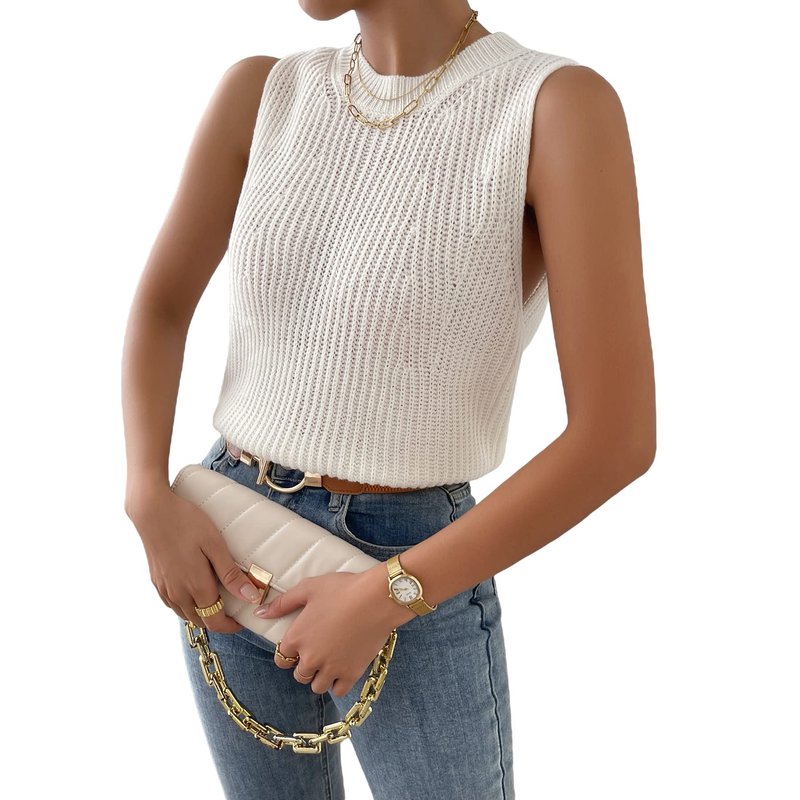 Verdusa Women's Slit Hem Sleeveless Round Neck Knitted Sweater Vest Tank Top White M