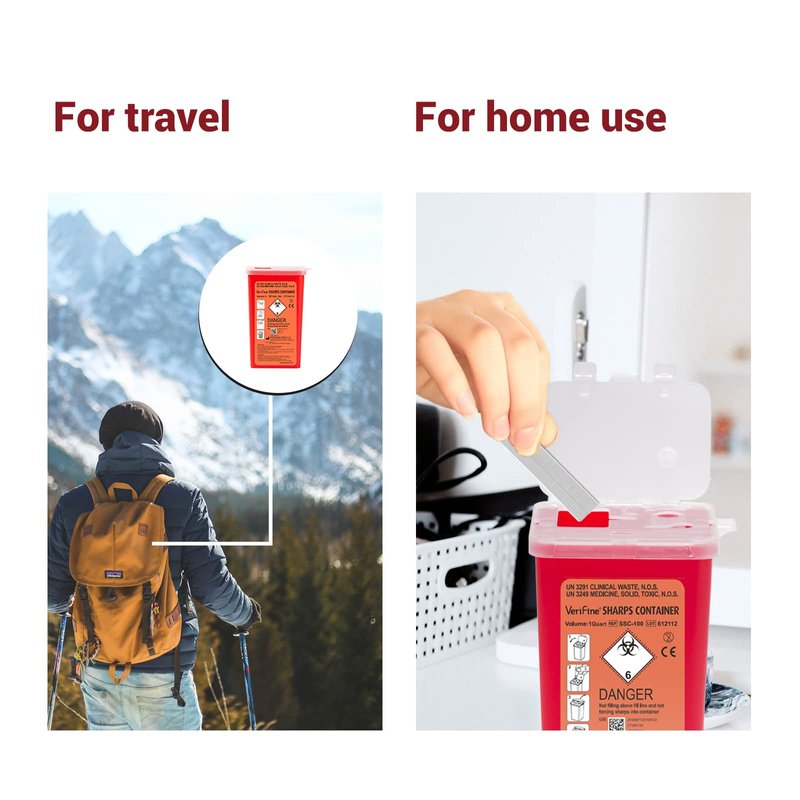 - Sharps Container - Ideal for handling needles, lancets, test strips, etc. Needle disposal containers at home or on the go. Clear lid allows viewing of fill level, temporary closure for security, and snap lock for final disposal.