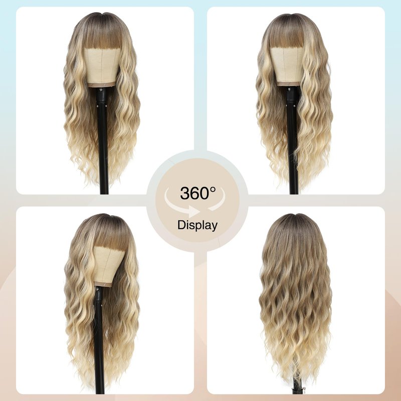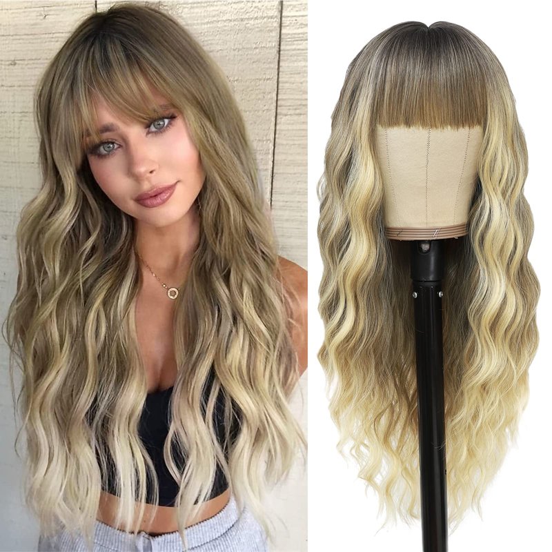 VERNA Blonde Wavy Wig with Bangs for Women, 26 Inch Long Blonde Wigs with Bangs for Women, Natural Looking Curly Blonde Wig, Heat Resistant Synthetic Wig, Middle Part Ombre Blonde Wavy wig for Daily