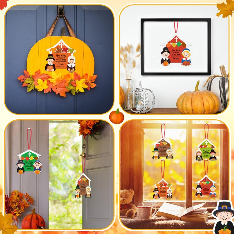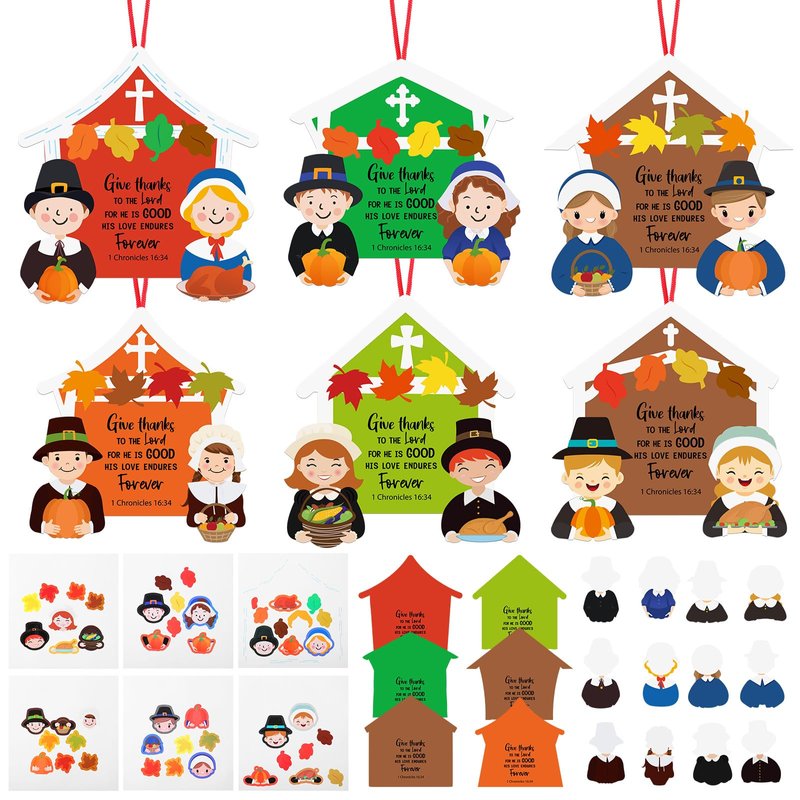 Vertintong 24 Sets Thanksgiving Craft Kit for Kids Pilgrim “Give Thanks” DIY Stickers Fall Autumn Ornaments Making Kit Make Your Own Crafts Church Sunday School Classroom Party Door Hanging Decoration