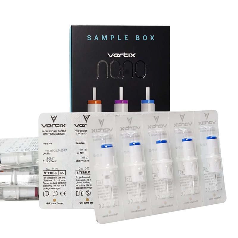 If you're new to the Vertix Nano line, you're in for a treat. We designed these single-use needle cartridges for tattooing, microblading and permanent cosmetic applications; and they can be used as rotary tattoo needles for fine-tuned precision work. These tatoo needles are also made of the highest quality 316L stainless steel, and have been optimized to help prevent some of the most common tattoo mishaps. Each tattoo needles pack comes with 20 tattoo cartridges needles, so make sure to stock up before starting a major project. They can be used as tattoo pen cartridges, and feature an acupuncture taper that helps increase visibility. On top of that, another thing that makes these great needles for tattooing fine line work is that they feature a hummingbird tip. This, and other details like the needles tattoo ink reservoir and dual side vents also help minimize the risk of small issues or pigment spraying; so you can trust that with Vertix, every project will be in the great, steady hands you need.