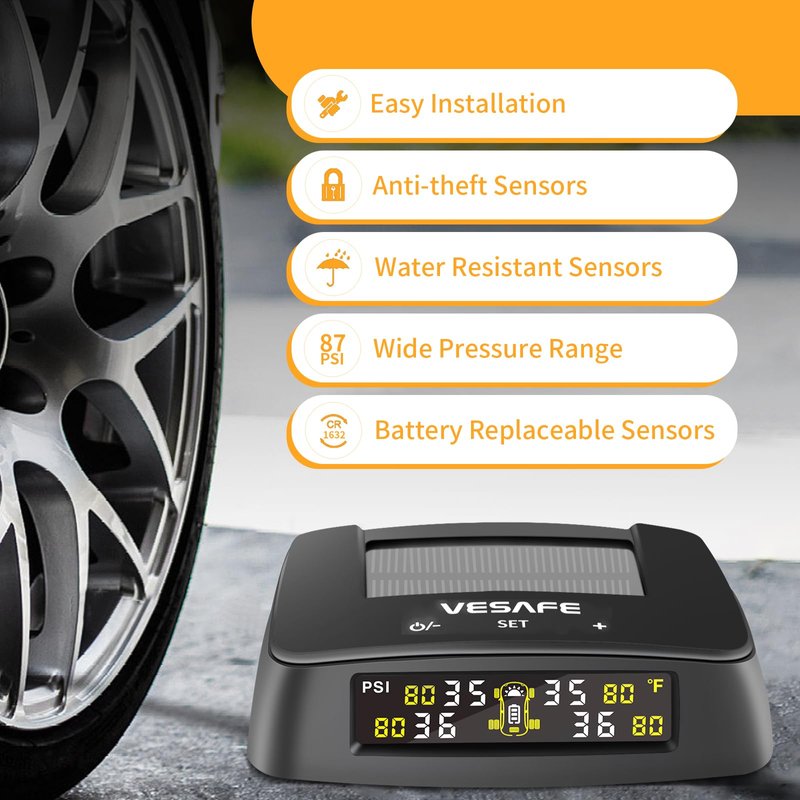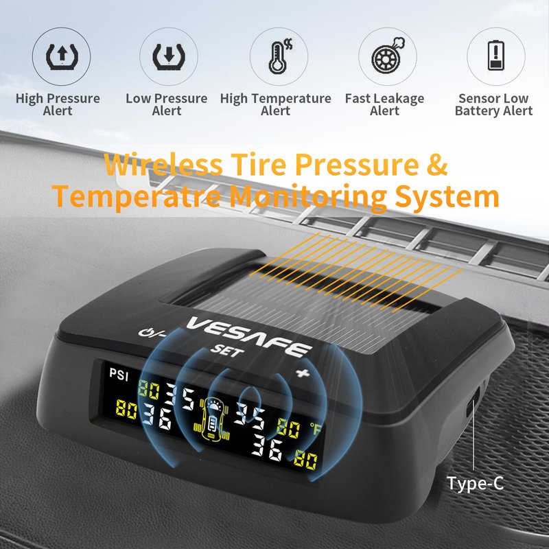 - VESAFE Solar display tire pressure monitoring system, Provides 4 tires’ Real-time Pressure or Temperature Simultaneously, and provide visual warning light and audible alarm sound immediately when tire’s pressure or temperature thresholds are exceeded.
