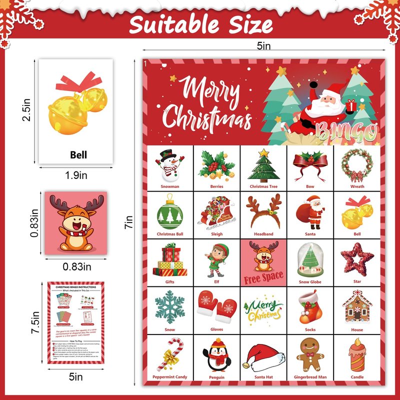 - Christmas Bingo Cards Included:30 sheets Christmas bingo player cards with 24 unique part,24PCS large calling chips,648PCS Bingo marking Chips and a manual.It can make kids adults of all ages and large groups to have a fun time in Christmas party.
