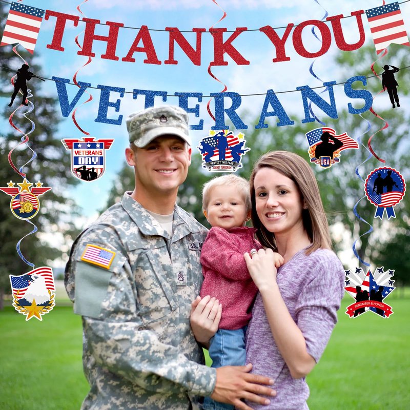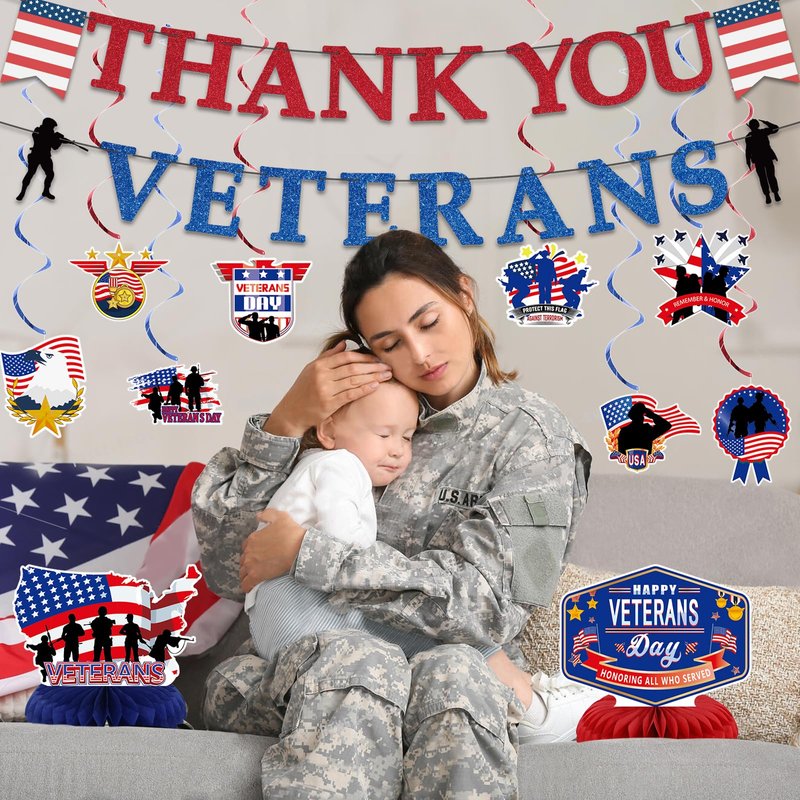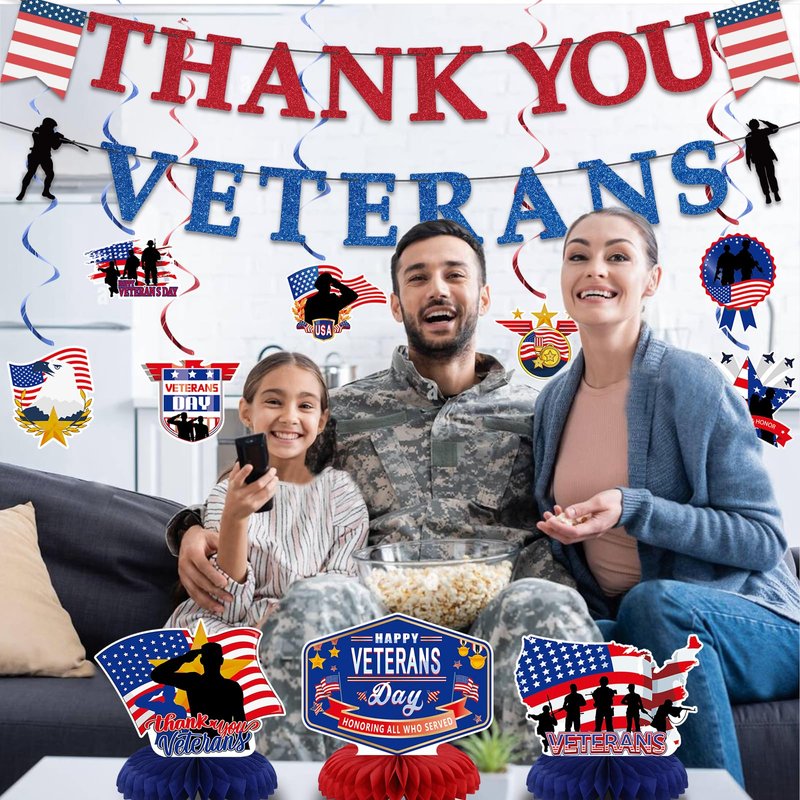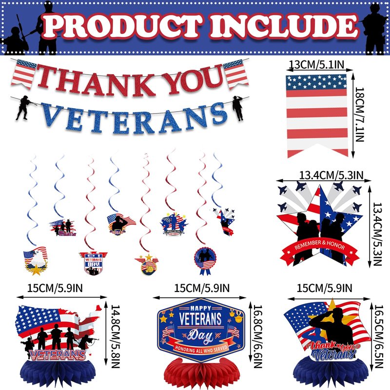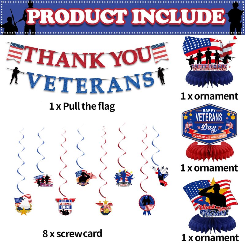- 【Thank You Veterans Party Decorations】1pcs Thank You Veterans banner, 8pcs hanging swirls with cards and 3pcs Centerpiece Honeycomb, perfect for Veterans Day Party Decoration, make your Memorial Day decoration a big hit!
