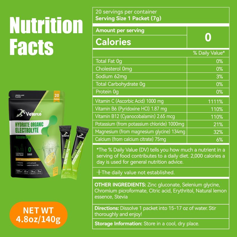 - Naturally Healthy Lifestyle: Veterco Electrolyte drink mix made with 5 key electrolytes - magnesium, calcium, potassium, chloride and sodium, as well as vitamin and zinc, which are crucial for maintaining proper hydration and bodily functions. Electrolyte powders are usually mixed with water to create a hydrating beverage that helps replenish lost fluids and electrolytes more efficiently than water alone.