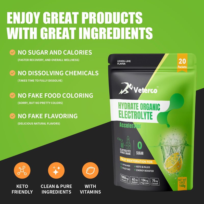 - KETO Electrolyte Power Packets: Veterco individual electrolyte powder packets do more than just help replenish lost sodium and potassium. Individual on a ketogenic diet, especially those who are physically active or experiencing symptoms like fatigue, muscle cramps, or headaches, may benefit from using ketogenic electrolyte powder to help maintain optimal hydration and electrolyte levels while supporting their dietary goals.