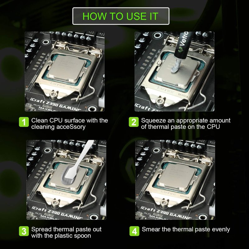 - Excellent Performance: The compound is composed of carbon micro-particles which lead to an extremely high thermal conductivity. It guarantees that heat generated from the CPU or GPU is dissipated quickly and efficiently