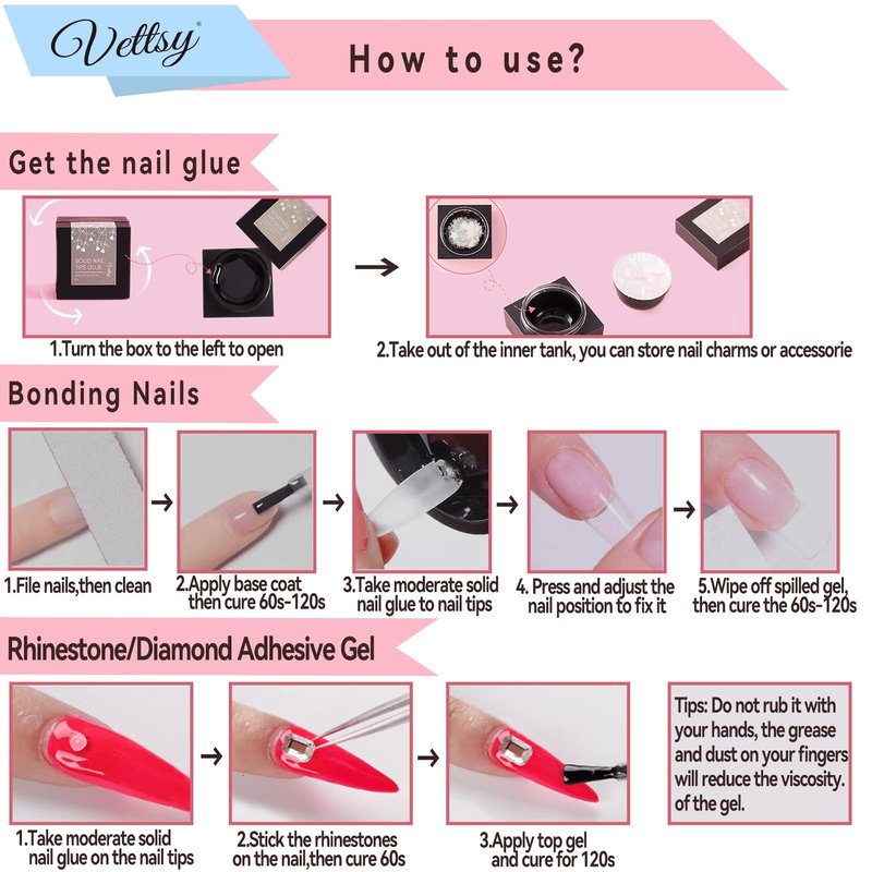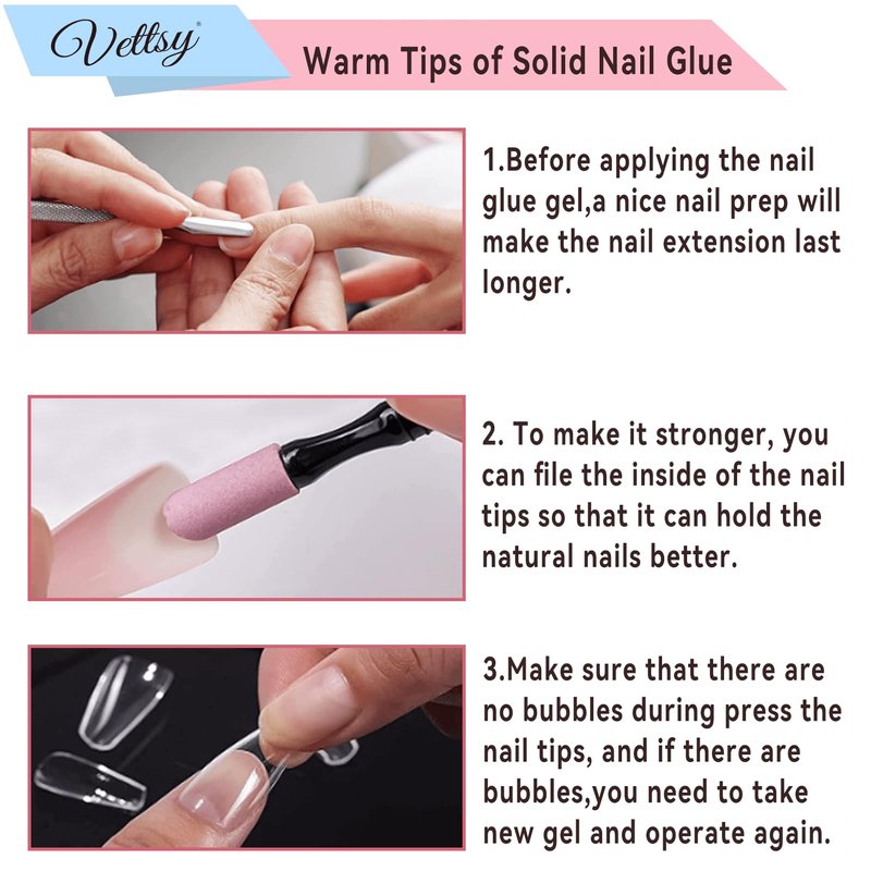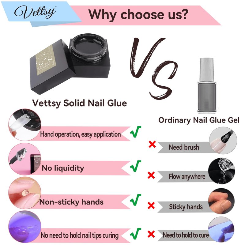 - ⭐【Upgrade Solid Nail Glue】 Vettsy solid nail glue gel is a new type of nail glue gel for nail tips, this solid nail gel is non-sticky hand, beginner friendly. Solid material and the texture look like rubber, the solid gel will not flow anywhere, and no need to hold nail tips curing, it has stronger adhesion than liquid glue after it was cured under a nail lamp, and is easier to operate.