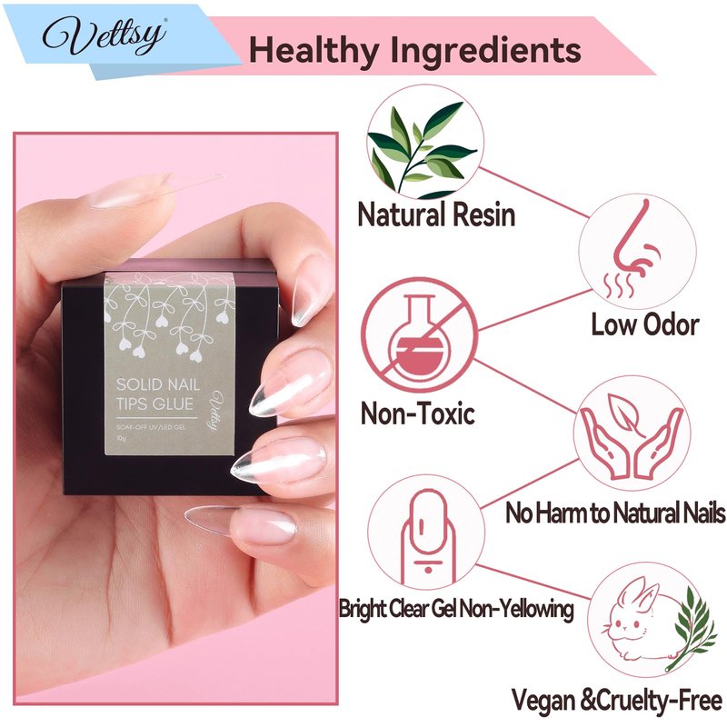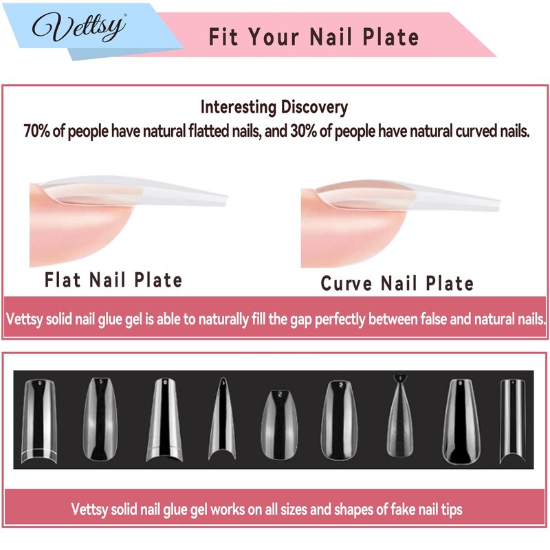 - ⭐【Long-Lasting & Strong Adhesion】 Vettsy solid nail tips gel glue can last up to 21+ days. Most suitable match for all professional manicurists & beginners for DIY at home. It can meet multiple nail art job needs at the same time.This solid nail gel is super sticky, has strong adhesion, and doesn't need to hold nail tips to cure. Fit for flat and curved nail beds.