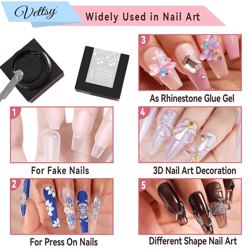 - ⭐【DIY Nail Art Gel Glue】 Vettsy solid nail gel doesn't slip and slide, suitable for professional manicurists and beginner nail lovers, it can meet the needs of a variety of nail artwork at the same time. Enjoy a salon experience with your friend and family at home, creating beautiful nail art designs. Wonderful as a gift for mother,sisters,girlfriend,wife.Perfect as a present for wedding,prom,dating, parties, and costume balls for Halloween, Thanksgiving, Christmas, Valentine's Day, etc.