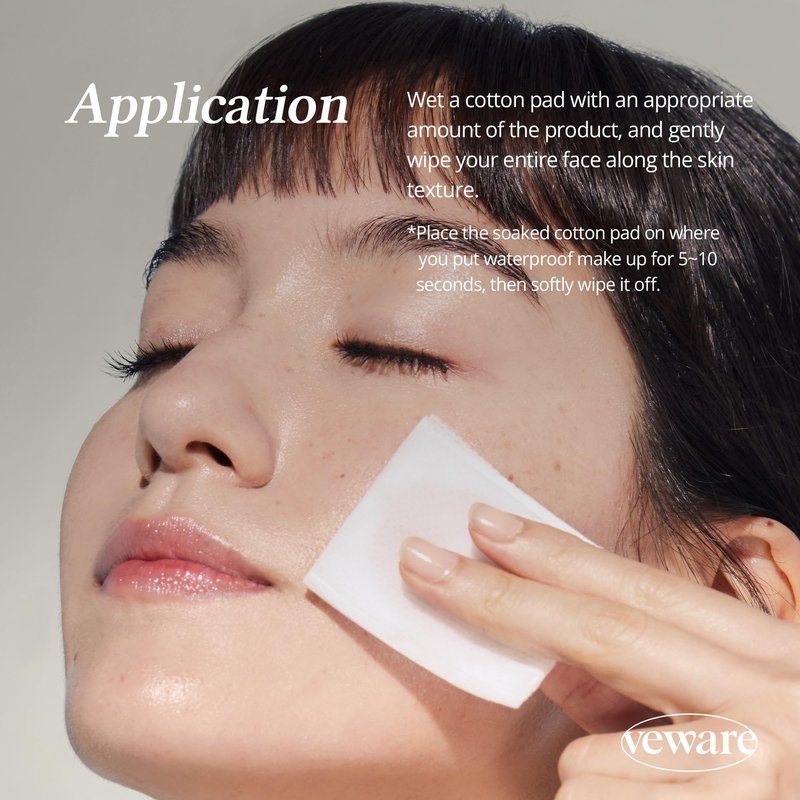 Ve yourself, my daily vegan life, Veware. Veware, a compound word of vegan+ware, is a vegan beauty brand designed to provide everything(ware) for vegan. Cleansing water refreshingly that removes makeup and impurities from skin with micro micellar particles measuring 1/100 of pore size. - pH balancing Cleansing water that restores skin balance. : It balances oil and moisture level of the skin, by making it close to the pH index of the skin. - Micellar particles cleansing : Micro micellar particles that are 1/100 the size of the pores - No animal derived ingredients. : With panthenol, it helps strengthen the skin barrier and gives soothing effects to the skin. : With Madecassoside and Hyaluronic acid, helps rejuvenate the skin, preventing the skin from drying and keeping moisture. - Packages of Veware are designed for easy recycling. - Comforting scent of Eucalyptus/peppermint scent. On cotton pad, put an appropriate amount of the product, and gently wipe your entire face along the skin texture where you put make up on. It's no wash cleanser, but it's recommended to finish with lukewarm water or a gentle seconde cleanse. Recommended to place the soaked cotton pad on your eye or lip make up for 5 to 10 seconds then softly wipe it off.