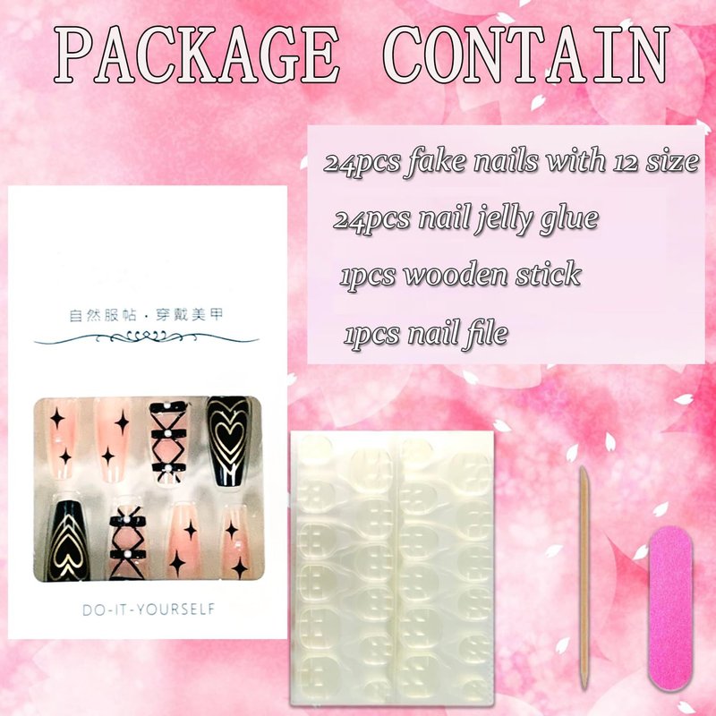 - 【False Nails Sets】You'll get 24 medium coffin heart false nails in 12 sizes. 1 mini nail file, 1 small wooden stick, 1 piece of press on nails adhesive sticky tabs.