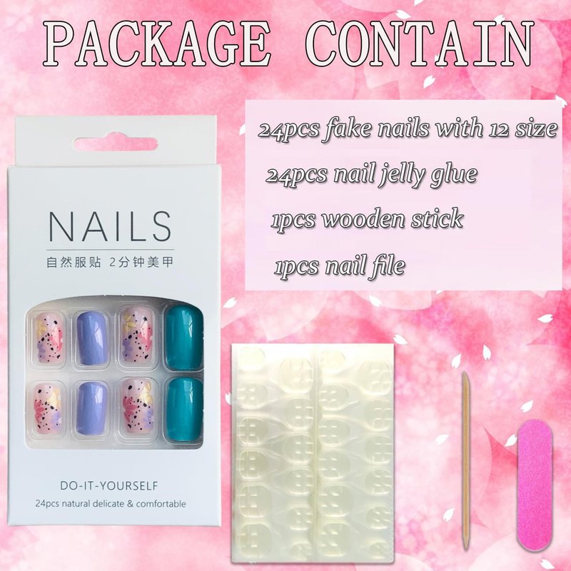 - 【Multiple Sizes】You'll get 24 false nails in 12 sizes. 1 mini nail file, 1 small wooden stick, 1 piece of nail glue sticker. Glue on nails are perfect for most people's nails.