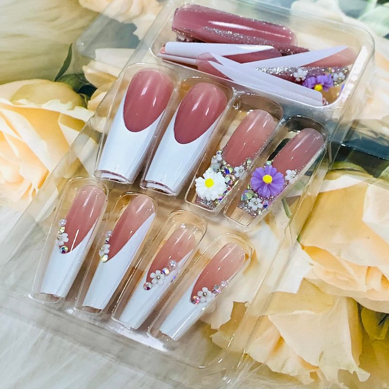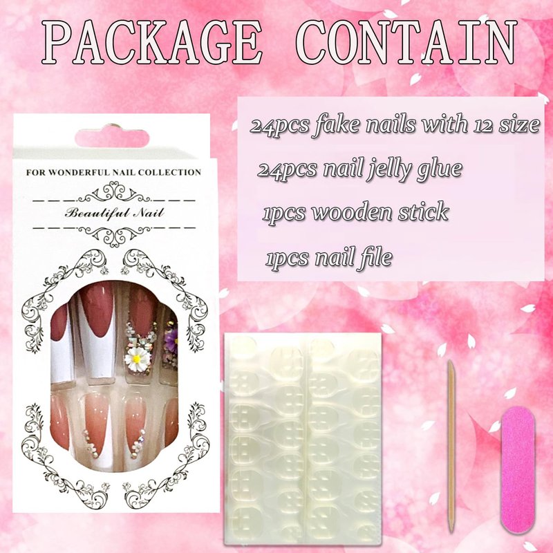 - 【False Nails Sets】You'll get 24 extra long coffin false nails in 12 sizes. 1 mini nail file, 1 small wooden stick, 1 piece of press on nails adhesive sticky tabs.