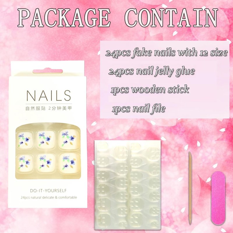 - 【False Nails Sets】You'll get 24pcs glue toenails in 12 sizes. 1 mini nail file, 1 small wooden stick, 1 piece of nail adhesive tabs.